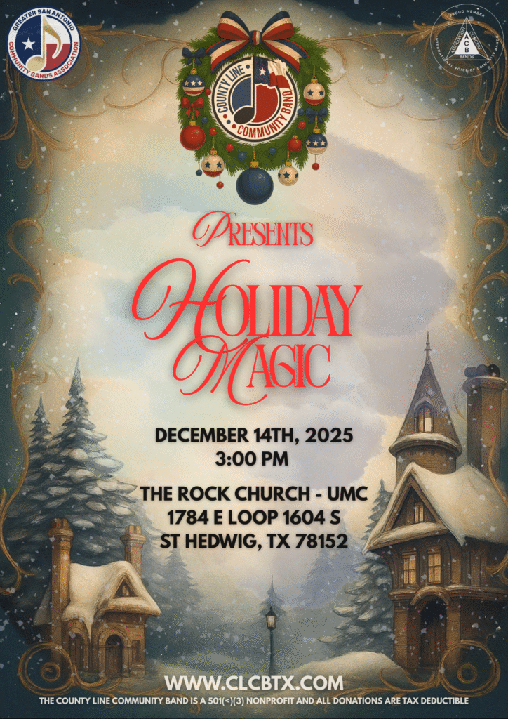 Join the County Line Community Band as they spread the joy of the holidays through great music! The free concert will be a 3pm on Sunday, December 14 when you will hear all the great songs from the great movies you love at The Rock UMC in St. Hedwig. Don’t miss out, mark your calendar now!